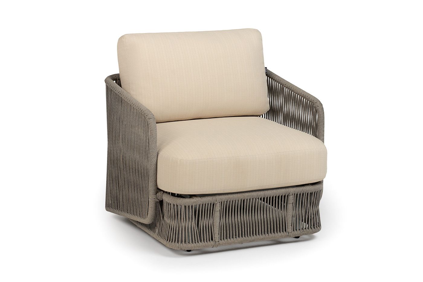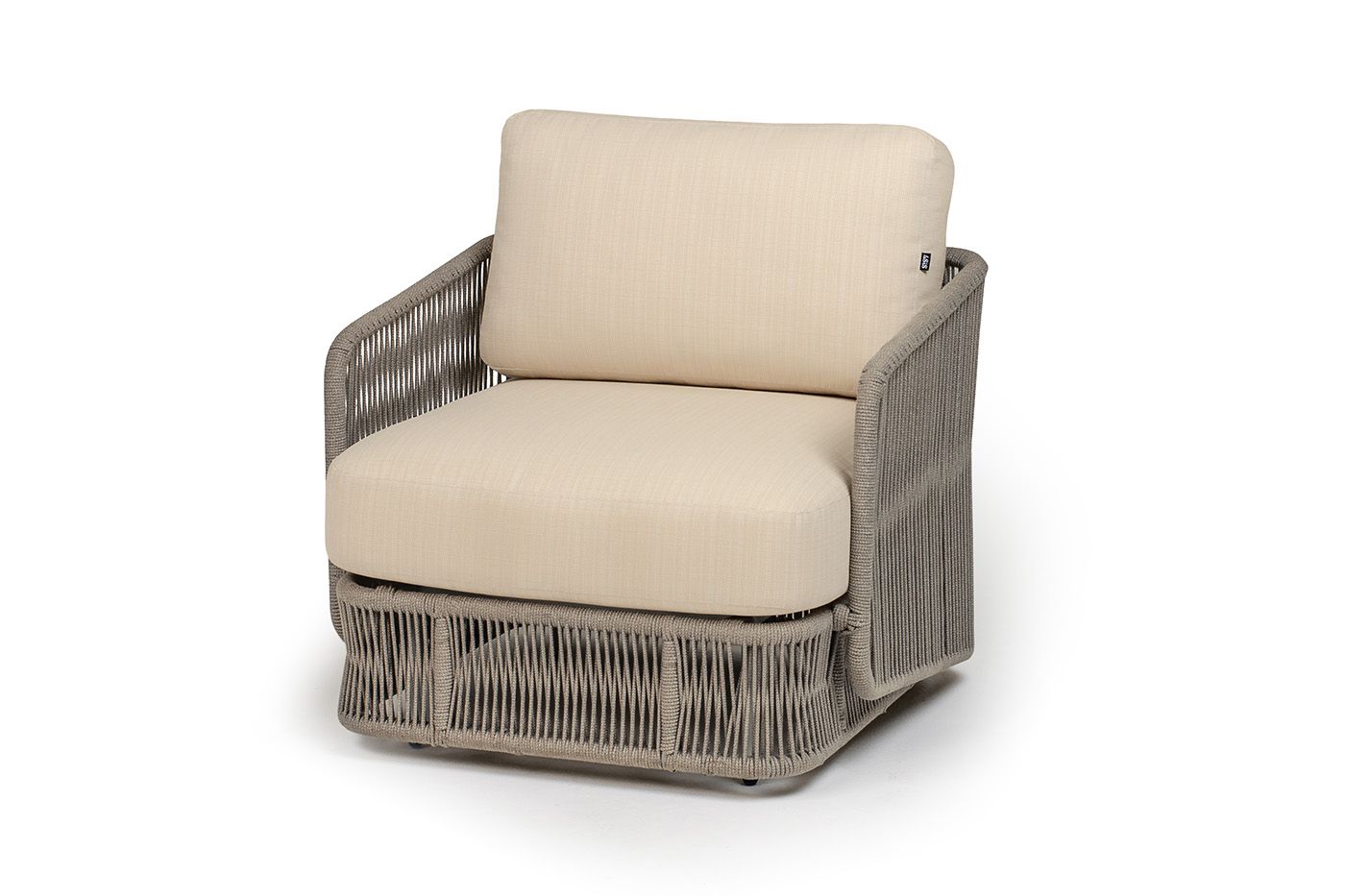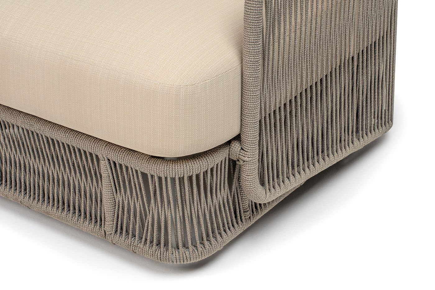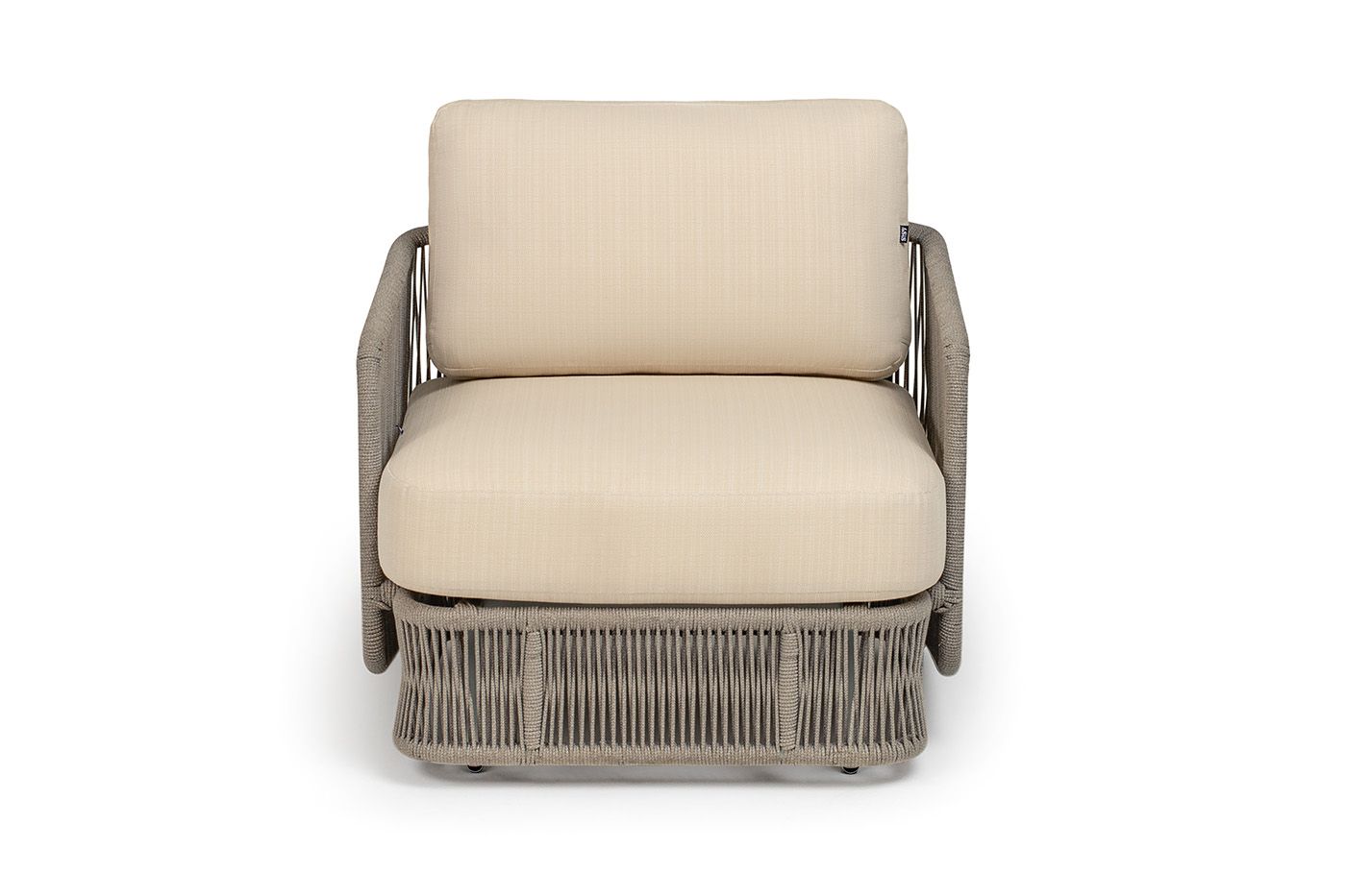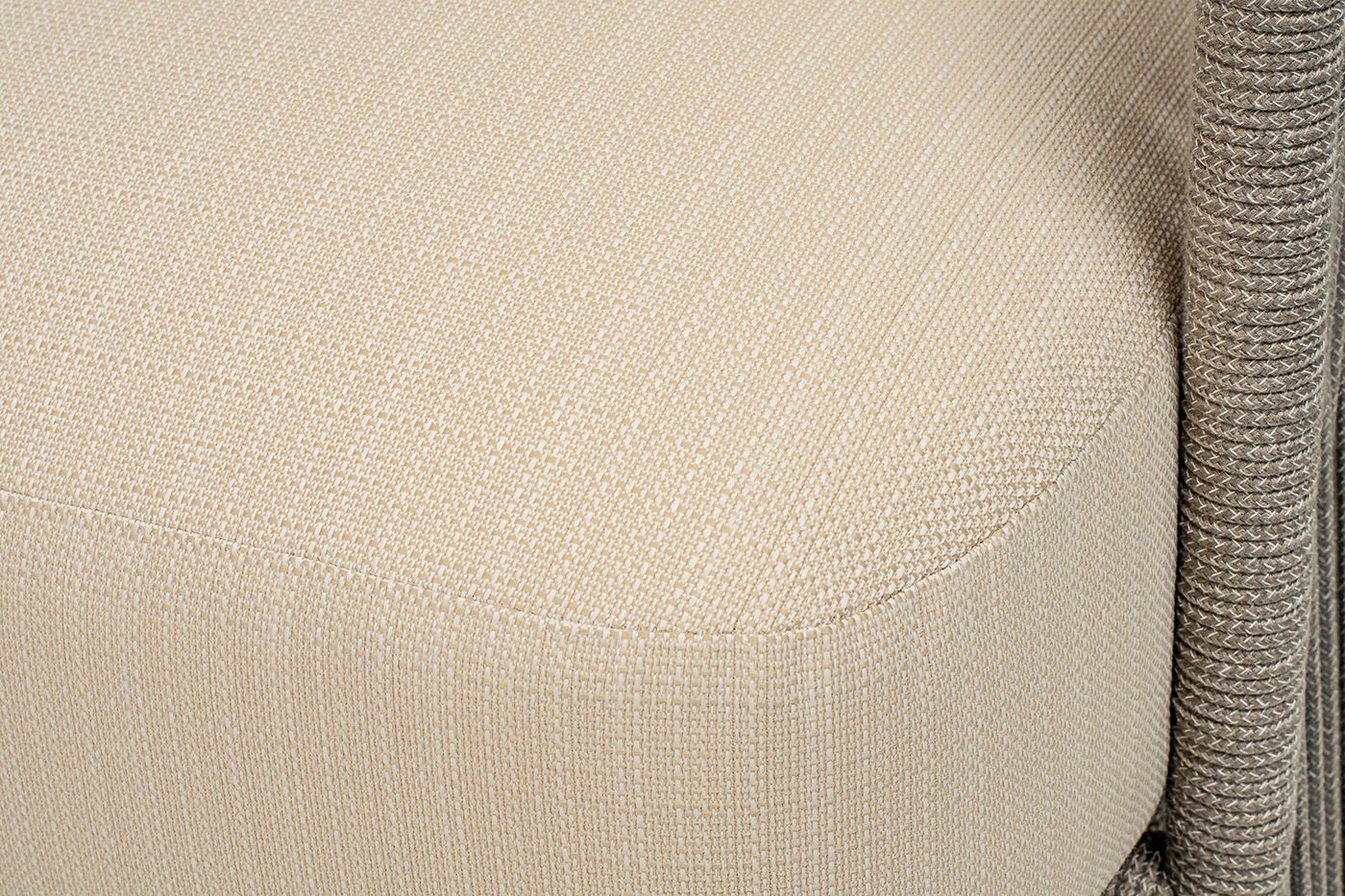 "Альбано" кресло плетеное из роупа, каркас алюминий светло-серый (RAL7035) муар, роуп серый меланж круглый, ткань Mossle светло-бежевая
